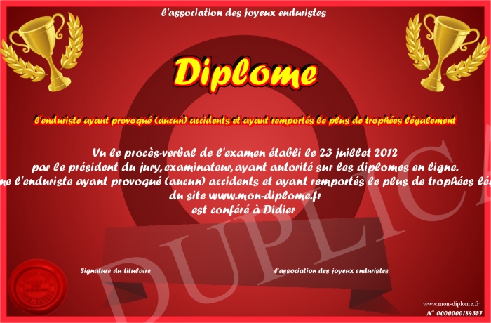 Envoyez par email votre Diplôme l'enduriste ayant provoqué (aucun) accidents et ayant remportés le plus de trophées légalement personalisé