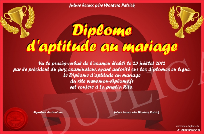 Envoyez par email votre Diplome d'aptitude au mariage personalisé