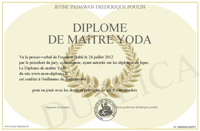Envoyez par email votre Diplôme de maître Yoda personalisé