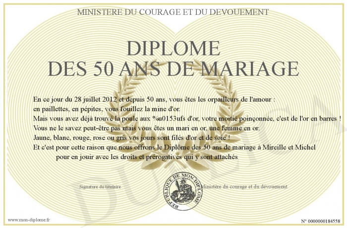 Envoyez par email votre Diplôme des 50 ans de mariage personalisé