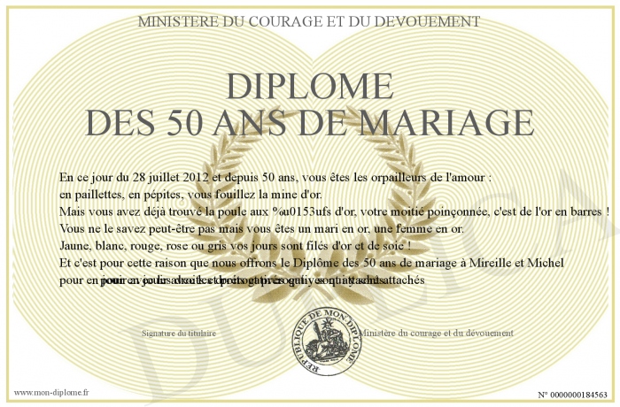 Envoyez par email votre Diplôme des 50 ans de mariage personalisé