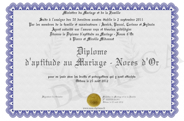 Envoyez par email votre Diplôme d'aptitude au Mariage - Noces d'Or personalisé