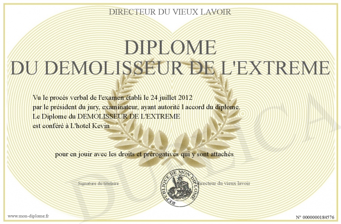 Envoyez par email votre Diplôme du DEMOLISSEUR DE L'EXTREME personalisé