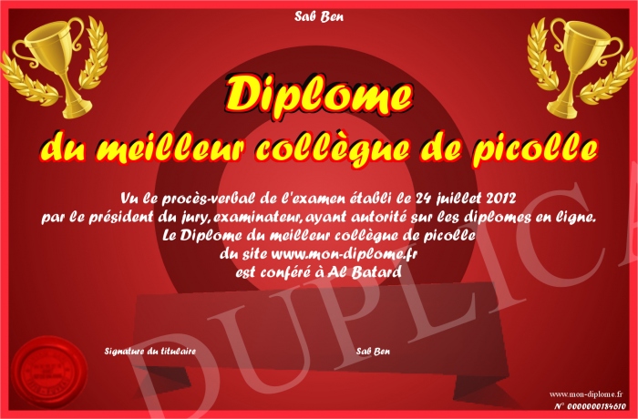 Envoyez par email votre Diplome du meilleur collègue de picolle personalisé