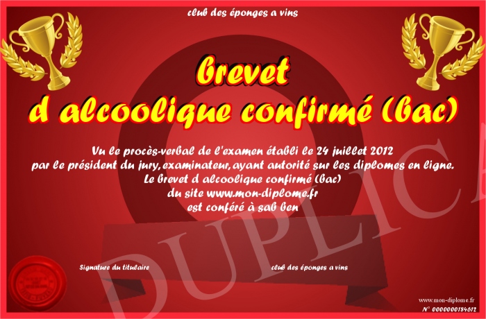 Envoyez par email votre brevet d alcoolique confirmé (bac) personalisé