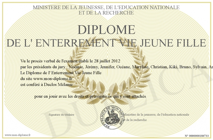 Envoyez par email votre Diplôme de l' Enterrement Vie Jeune Fille personalisé