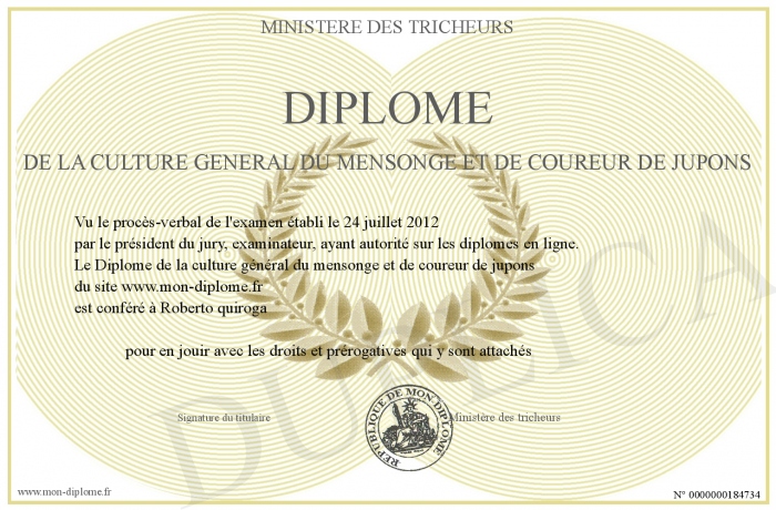 Envoyez par email votre Diplôme de la culture général du mensonge et de coureur de jupons personalisé