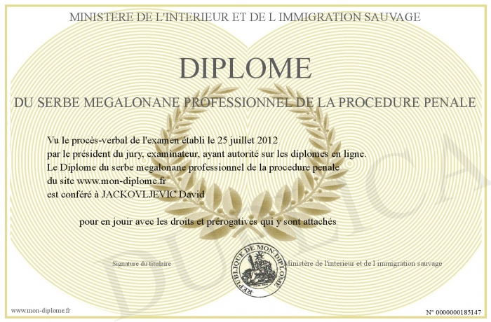 Envoyez par email votre Diplôme du serbe megalonane professionnel de la procedure penale personalisé