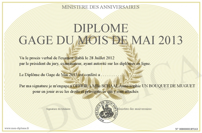 Envoyez par email votre Diplôme gage du mois de mai 2013 personalisé