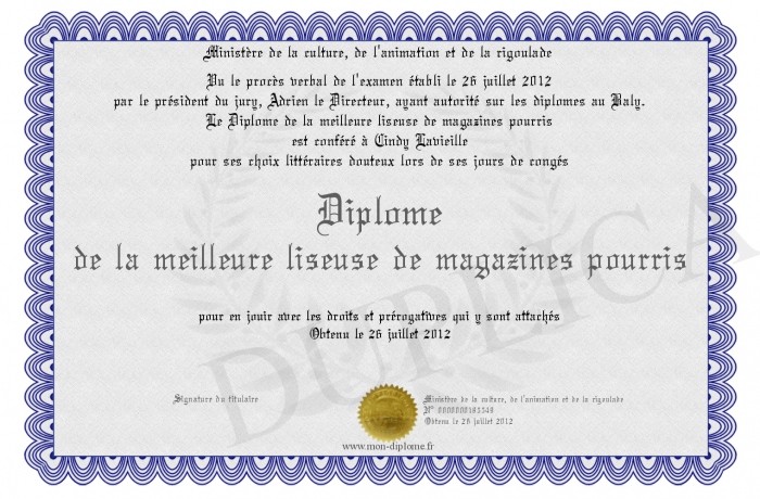 Envoyez par email votre Diplôme de la meilleure liseuse de magazines pourris personalisé