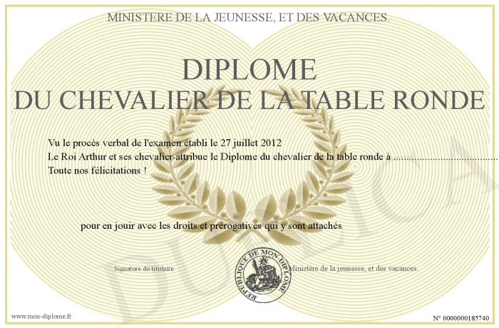 Envoyez par email votre Diplôme du chevalier de la table ronde personalisé