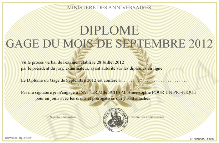 Envoyez par email votre Diplôme gage du mois de septembre 2012 personalisé