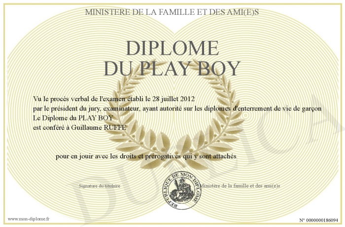 Envoyez par email votre Diplôme du PLAY BOY personalisé