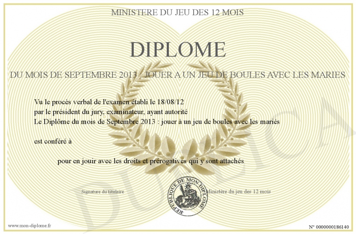 Envoyez par email votre Diplôme du mois de Septembre 2013 : jouer a un jeu de boules avec les mariés personalisé
