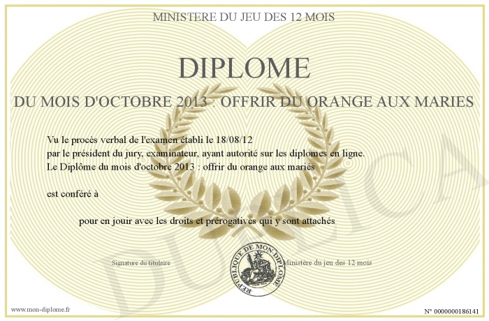 Envoyez par email votre Diplôme du mois d'octobre 2013 : offrir du orange aux mariés personalisé