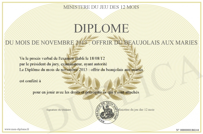 Envoyez par email votre Diplôme du mois de novembre 2013 : offrir du beaujolais aux mariés personalisé