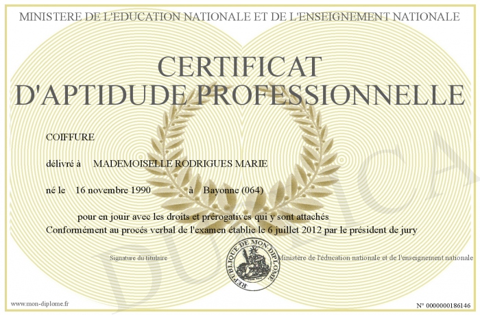 Envoyez par email votre CERTIFICAT D'APTIDUDE PROFESSIONNELLE personalisé