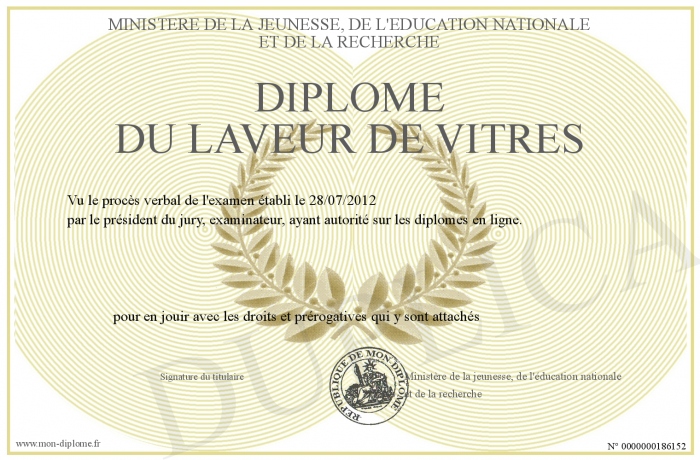 Envoyez par email votre Diplôme du LAVEUR DE VITRES personalisé