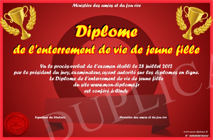 Envoyez par email votre Diplôme de l'enterrement de vie de jeune fille personalisé