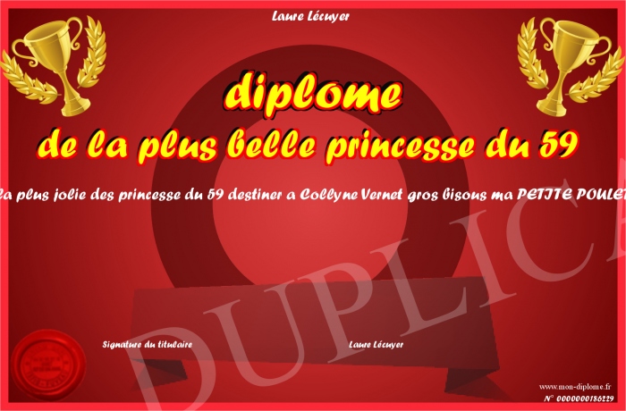 Envoyez par email votre diplôme de la plus belle princesse du 59 personalisé