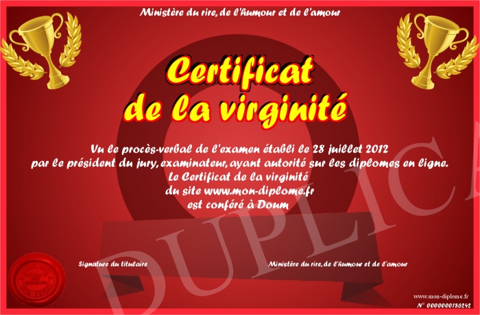 Envoyez par email votre Certificat de la virginité personalisé