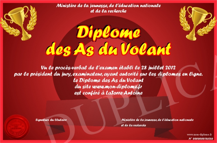 Envoyez par email votre Diplôme des As du Volant personalisé