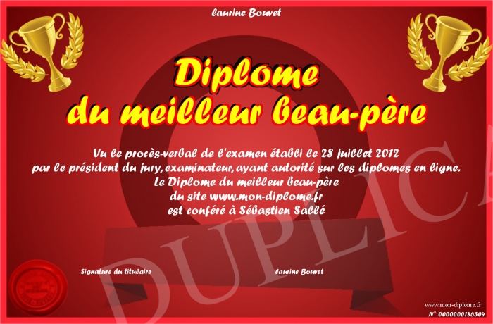 Envoyez par email votre Diplôme du meilleur beau-père personalisé
