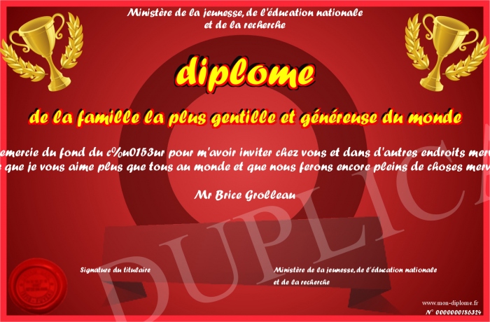 Envoyez par email votre diplome de la famille la plus gentille et généreuse du monde personalisé