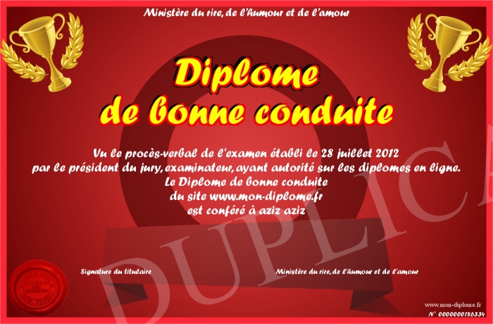 Envoyez par email votre Diplome de bonne conduite personalisé