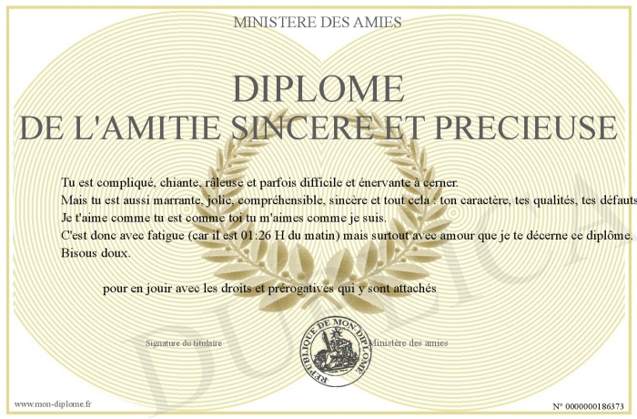 Envoyez par email votre Diplôme de l'amitié sincère et précieuse personalisé
