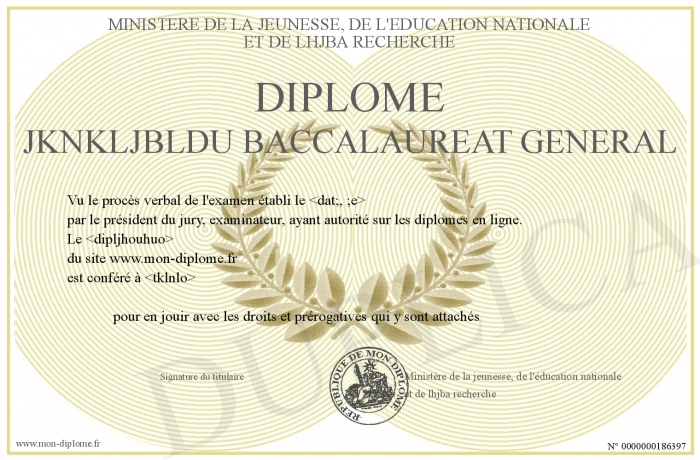 Envoyez par email votre Diplôme jknkljbldu baccalaureat général personalisé