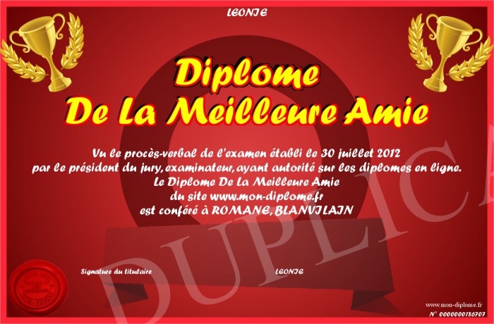 Envoyez par email votre Diplôme De La Meilleure Amie personalisé