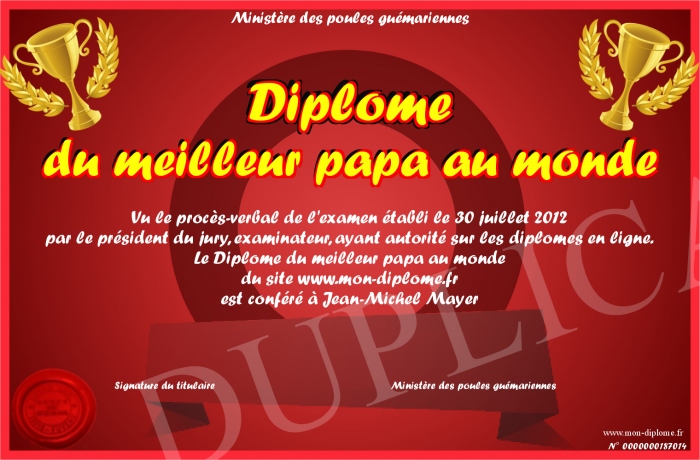 Envoyez par email votre Diplôme du meilleur papa au monde personalisé
