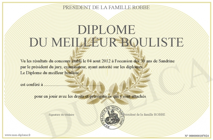 Envoyez par email votre Diplôme du meilleur bouliste personalisé