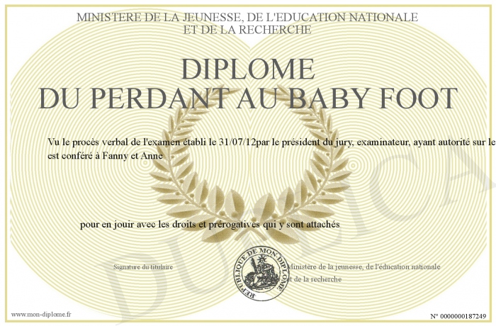 Envoyez par email votre Diplôme du perdant au baby foot personalisé