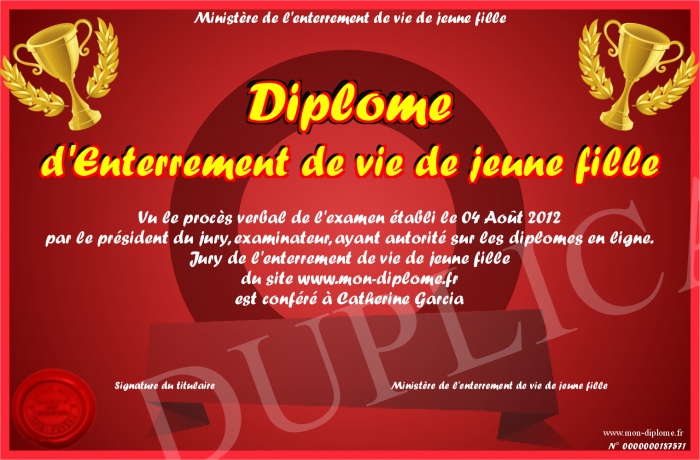 Envoyez par email votre Diplome d'Enterrement de vie de jeune fille personalisé