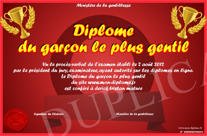 Envoyez par email votre Diplôme du garçon le plus gentil personalisé