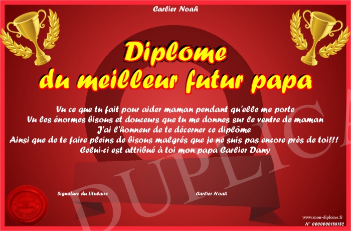 Envoyez par email votre Diplôme du meilleur futur papa personalisé