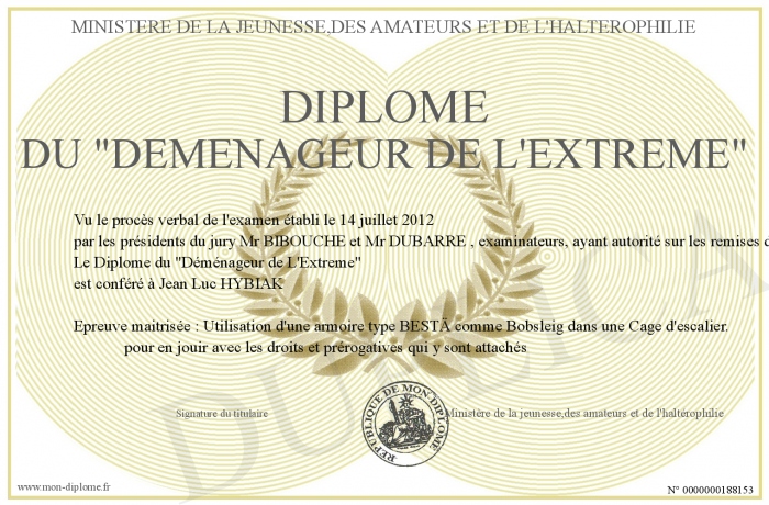 Envoyez par email votre Diplôme du -Déménageur de L'Extreme- personalisé