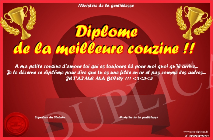 Envoyez par email votre Diplôme de la meilleure couzine !! personalisé