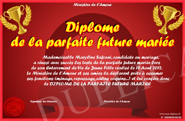Envoyez par email votre Diplôme de la parfaite future mariée personalisé