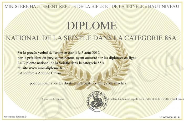 Envoyez par email votre Diplôme national de la Seinfle dans la catégorie 85A personalisé