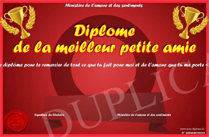 Envoyez par email votre Diplôme de la meilleur petite amie personalisé