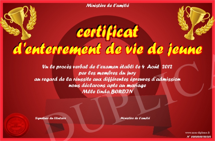 Envoyez par email votre certificat d'enterrement de vie de jeune personalisé
