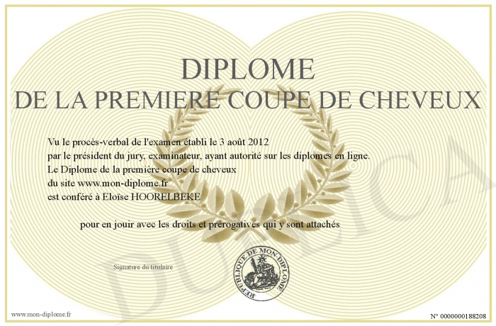 Envoyez par email votre Diplôme de la première coupe de cheveux personalisé