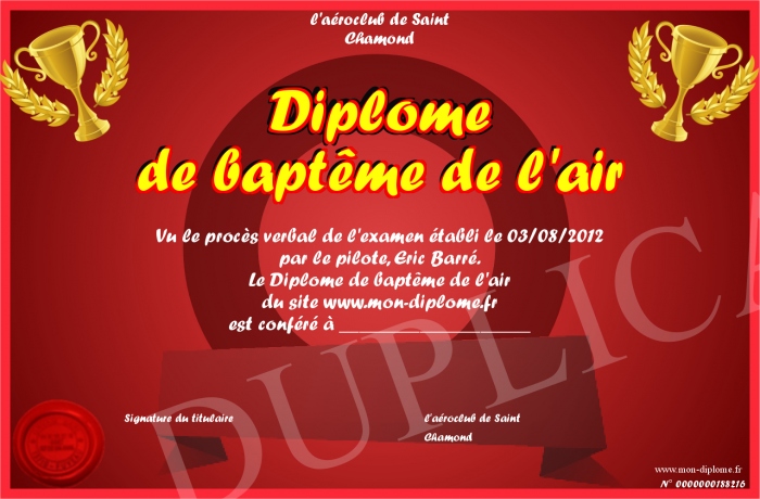 Envoyez par email votre Diplôme de baptême de l'air personalisé