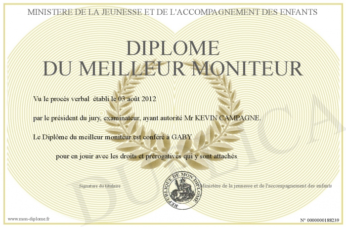 Envoyez par email votre Diplôme du MEILLEUR MONITEUR personalisé