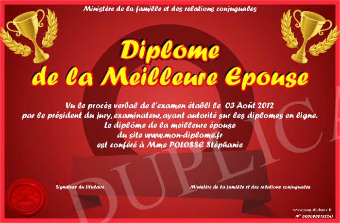 Envoyez par email votre Diplôme de la Meilleure Epouse personalisé