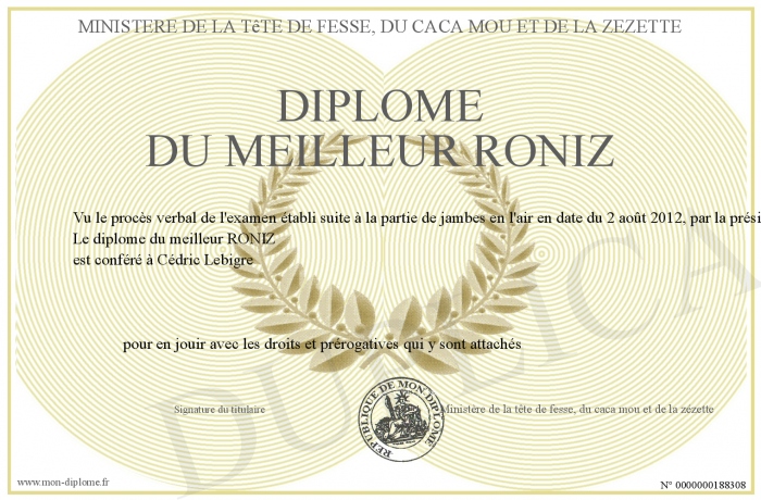 Envoyez par email votre Diplôme du meilleur RONIZ personalisé