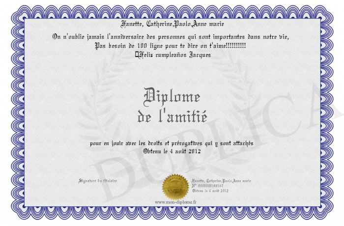Envoyez par email votre Diplôme de l'amitié personalisé